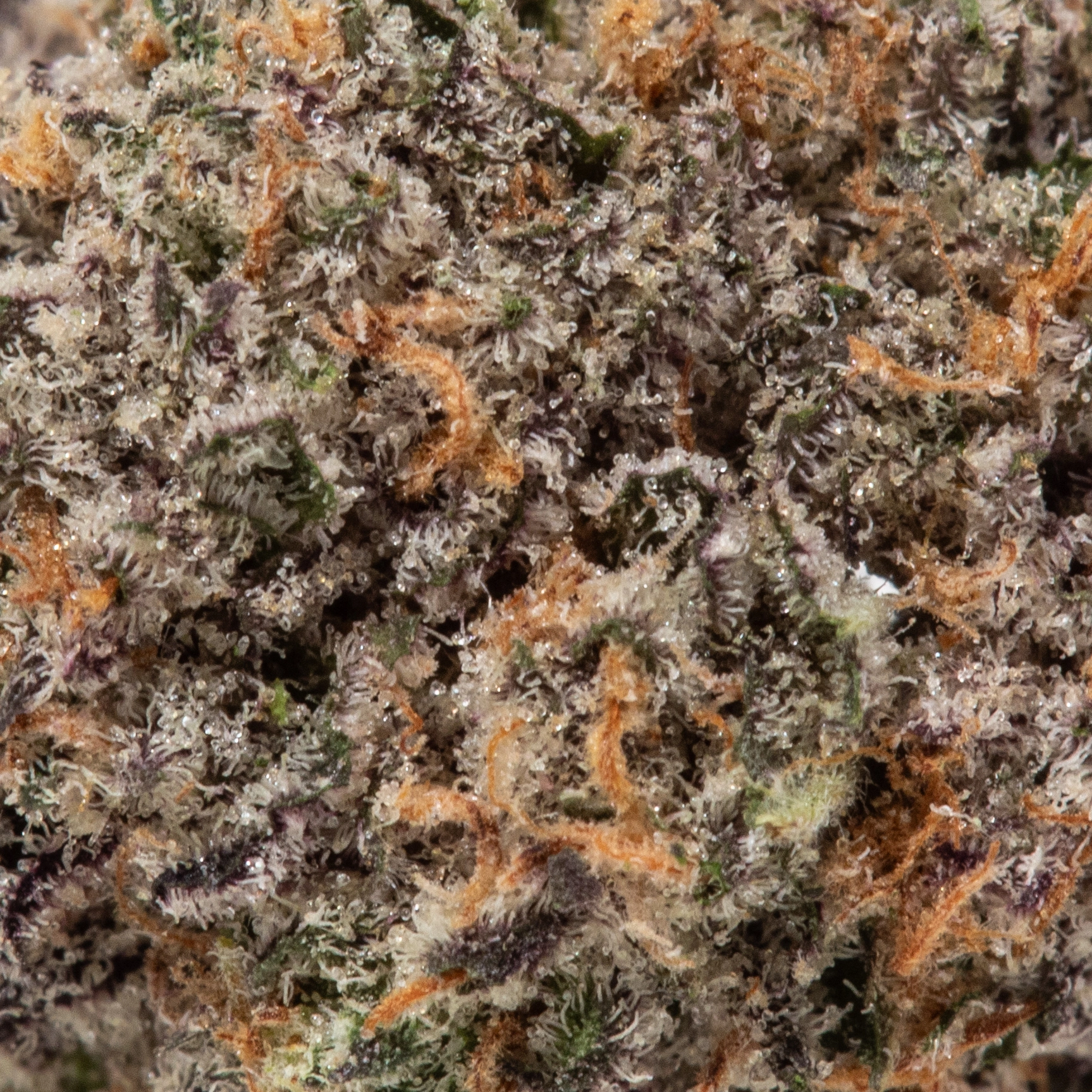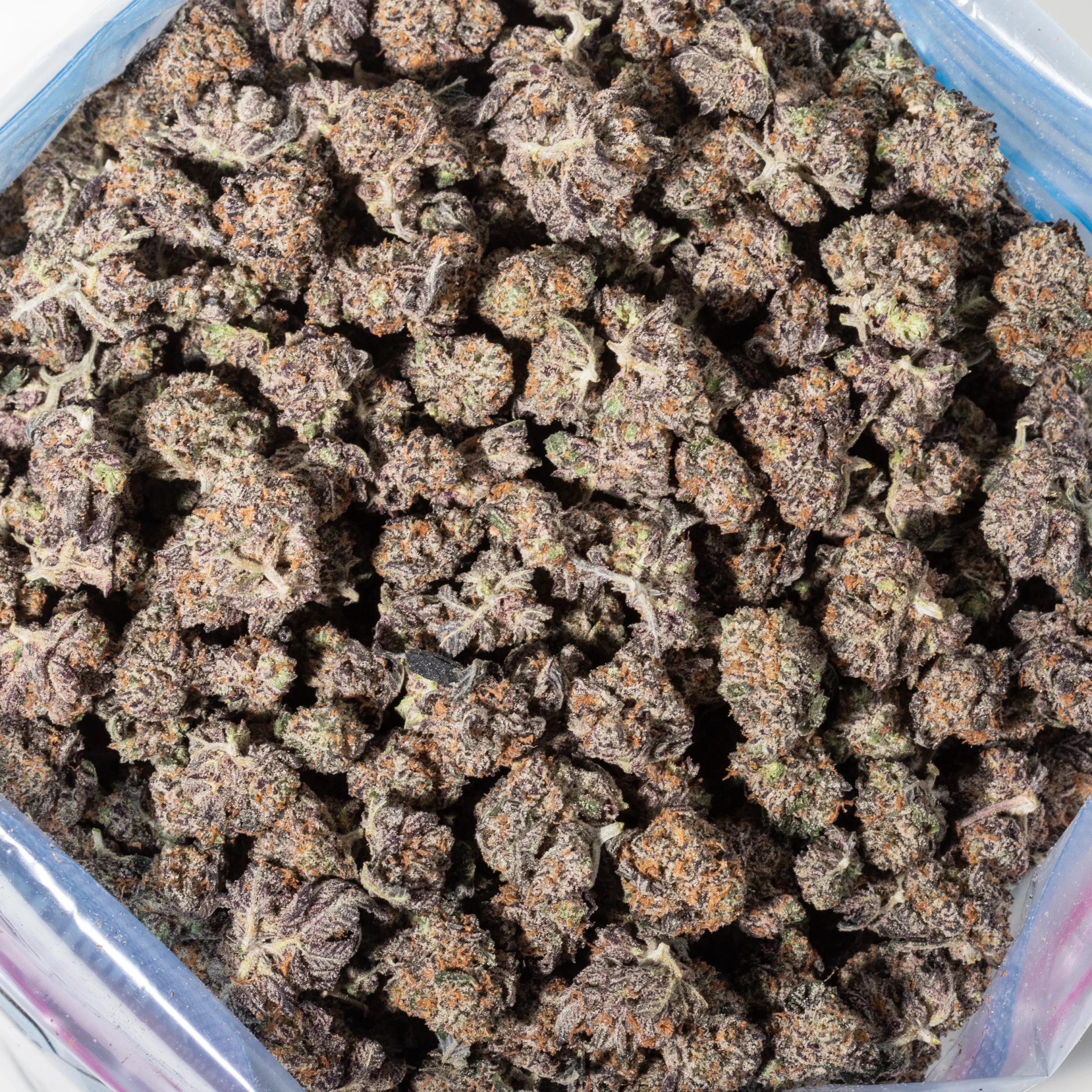 - Color:Â The buds are characterized by a stunning deep purple hue, often interspersed with bright green leaves and vibrant orange pistils. A thick layer of frosty trichomes gives them a sparkling, resinous appearance.